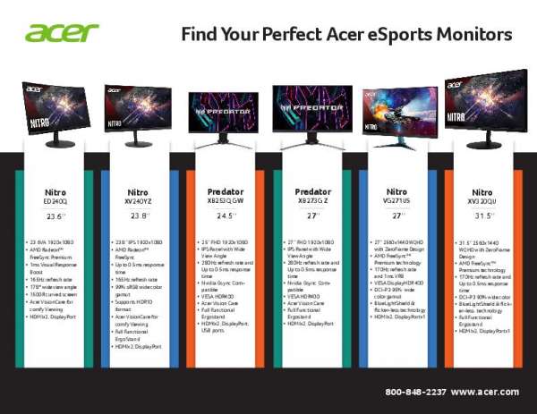 When it comes to eSports LCD monitors, nobody delivers more great choices than Acer. Select from six LCD monitors with screen sizes ranging from 23.6″ to 31.5″, a variety of configurations and refresh rates and frame designs. Check out the datasheet for the tech specs.