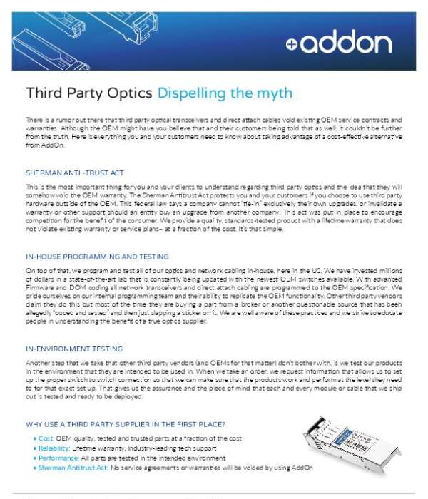 Tired of customers hesitating because they’ve “heard” third-party optics void OEM warranties? Here’s your response. This brief dispels the myth by referencing the Sherman Antitrust Act, which protects your customers’ right to choose third-party components. It also reinforces the technical credibility of AddOn’s solutions, with all parts tested in real OEM environments, and firmware coded in-house to meet spec. Download and use this to educate customers and your sales team: AddOn’s solutions will lower costs and raise performance.