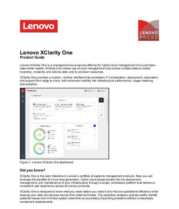 How about a hybrid-cloud management solution for your Lenovo DC that knows what you need before you need it? @Lenovo US XClarity One is a management-as-a-service offering for hybrid-cloud management of on-premises DC assets. The predictive analytics engines swiftly identify potential issues and minimize downtime by accurately identifying problems without unnecessary component replacements. It makes use of local management hubs across multiple sites to collect inventory, incidents, and service data, and to provision resources. Check out the product eGuide for technical details, and contact us today for help in configuring your system.