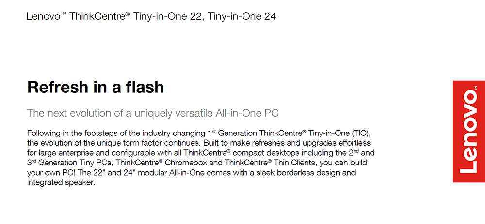 This valuable data sheet showcases the most compelling benefits of the ThinkCentre® Tiny-in-One systems. The data sheet stresses the many benefits available to your clients and prospects, including making refreshes and upgrades effortless and presenting a completely configurable display, while also introducing a sleek new design that is space saving and optimized for the user’s most critical applications.