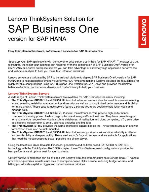 This solution overview explains that Lenovo ThinkSystem Servers are validated by SAP to be an ideal platform to deploy SAP Business One, version for SAP HANA and to help accelerate time to value for SAP implementations. For more information regarding Lenovo ThinkSystem Servers, please contact SomethingCool.com LLC.