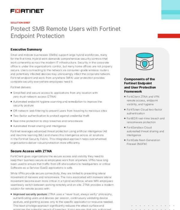 Remote employees are often the weak point in SMB security, connecting to networks through consumer-grade routers and potentially infected devices. The solution brief, “Protect SMB Remote Users with Fortinet Endpoint Protection,” shows how Fortinet integrates zero-trust access, two-factor authentication, endpoint hygiene scanning, and real-time breach prevention onto one platform. Download the solution brief to see how to secure remote users and protect your business. Contact SomethingCool.com LLC for guidance tailored to your needs.