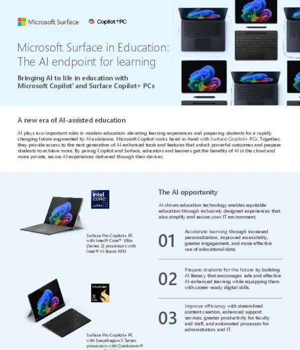 This overview of Surface devices and AI in education delves into how integrating Artificial Intelligence (AI) with Surface devices can remarkably reshape educational experiences. The focus is AI’s emergence in education via Microsoft Copilot – a companion working alongside Surface Copilot+ PCs, bringing a wealth of AI-enhanced tools and features for more productive and engaging learning. AI-driven education technology encapsulates inclusive designs ensuring equitable education while aiding in managing and safeguarding your IT environment. Moreover, it introduces increased personalization, greater user engagement, improved accessibility, and more effective usage of educational data; all streamlined for content creation. Check out this brief and to order the latest Surface device for education, contact us today.