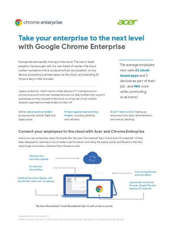 Acer’s two new enterprise-class Chromebooks, the Acer Chromebook Spin 13 and Acer Chromebook 13, are designed to optimize performance—providing the speed, power and flexibility that the modern worker needs to get more done, wherever they choose to work.