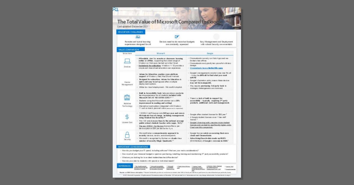 IT professionals in education face several challenges including enabling remote and hybrid learning experiences designed for all, delivering devices that do more with shrinking budgets, and ensuring robust security that’s easy to manage and deploy. What factors are important to consider when choosing a technology vendor? This solution brief provides a side-by-side value comparison of solutions and services offered by Microsoft and Google. Download the solution brief when evaluating factors such as device affordability and functionality, device management efficiency, accessibility, costs and security.