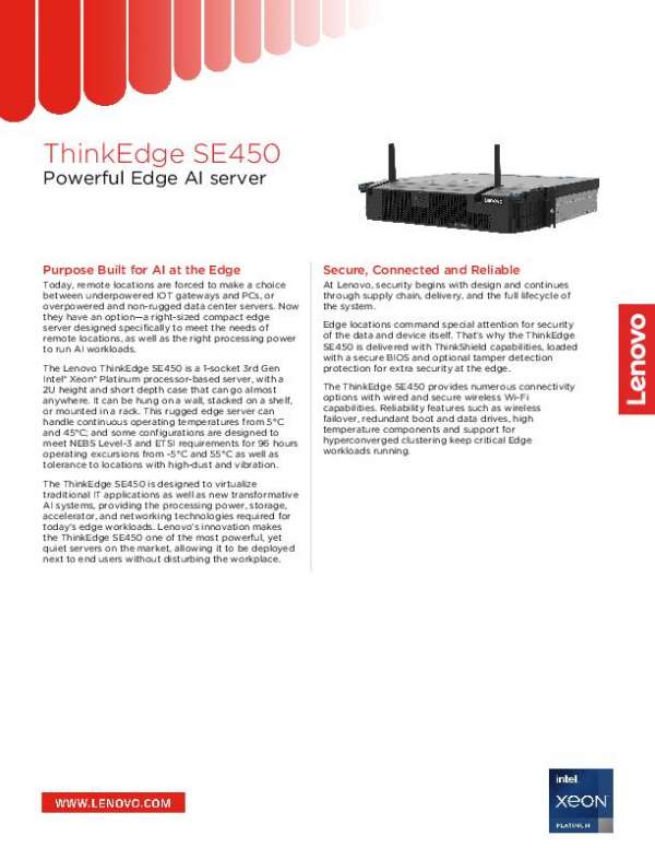 This datasheet describes the ThinkEdge SE450 as a right-sized compact edge server designed specifically to meet the needs of remote locations, as well as deliver the right processing power to run AI workloads. Please contact SomethingCool.com LLC for more information about the Lenovo ThinkEdge SE450.