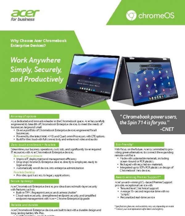 Get this datasheet to learn about Acer’s Enterprise Chromebook devices – designed with business in mind.